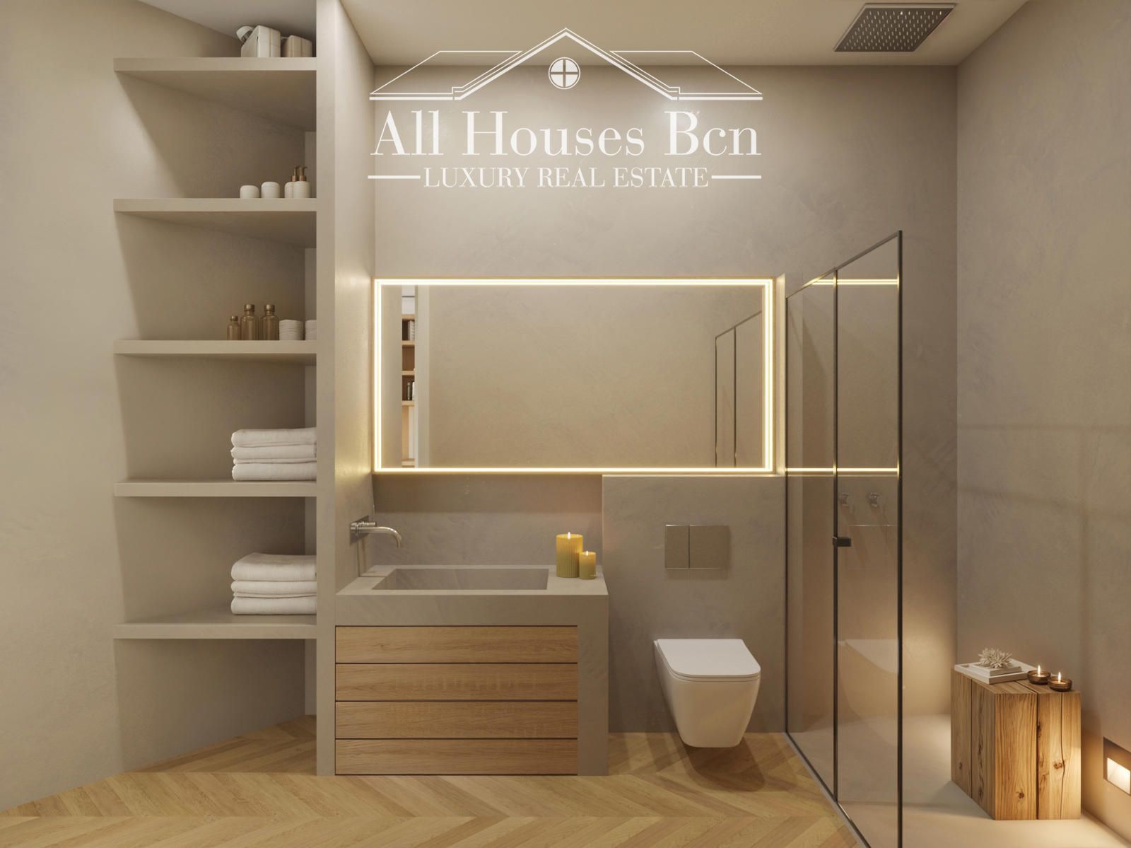 La vivienda cuenta con dos baños completos, ambos con una estética moderna y minimalista, combinando porcelánico texturizado, microcemento y madera. Están equipados con platos de ducha integrados, grifería de acero cepillado y mamparas de diseño en negro mate.