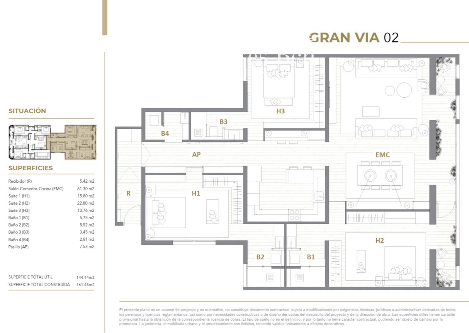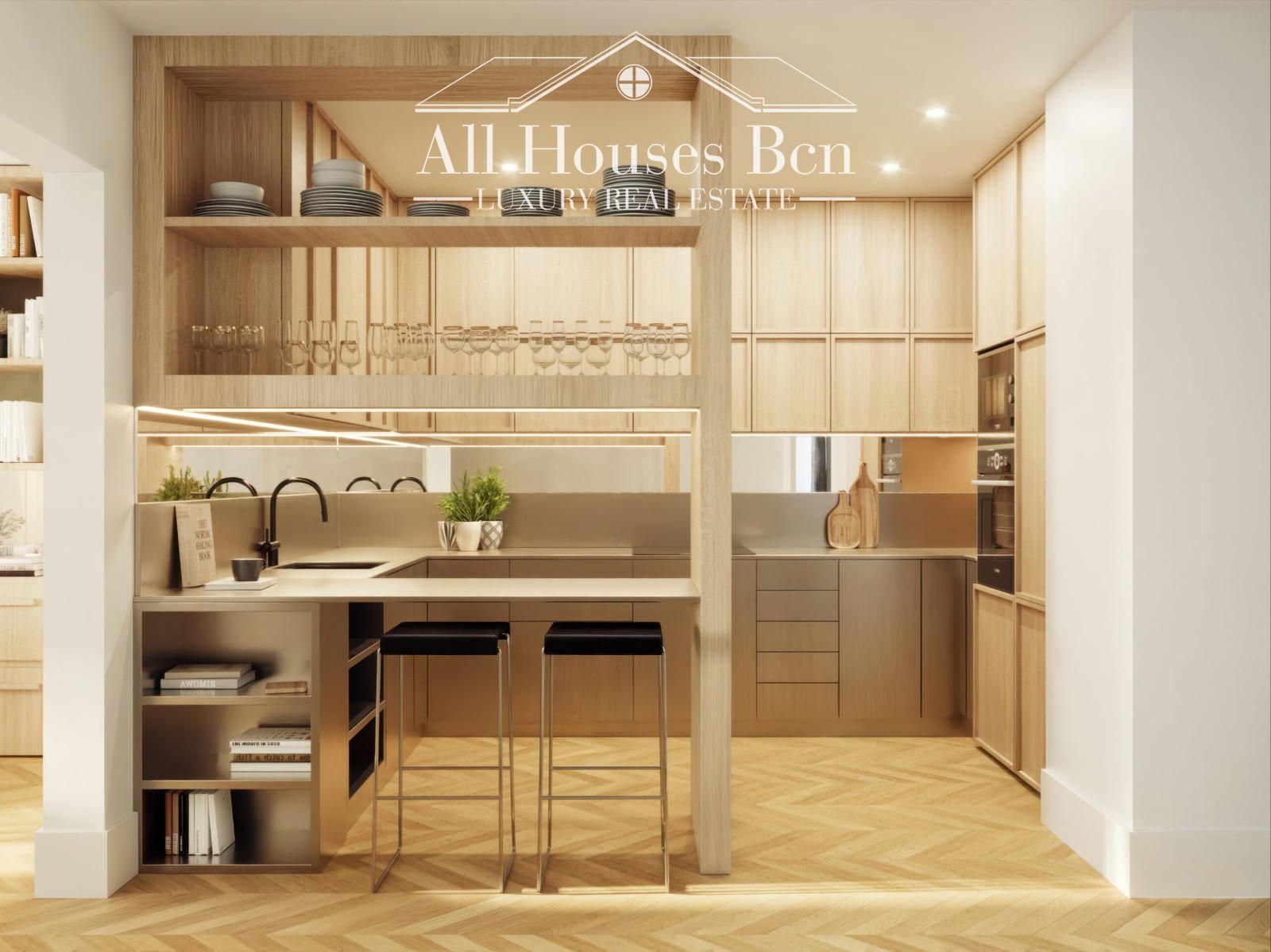 All Houses Bcn presenta esta espectacular vivienda de diseño a estrenar con una superficie aproximada de 161 m², destacando por su amplitud, su distribución generosa y su privilegiada orientación a la Gran Vía. Los balcones permiten disfrutar de una excelente entrada de luz natural, realzando la amplitud de los espacios y el estilo clásico del edificio.