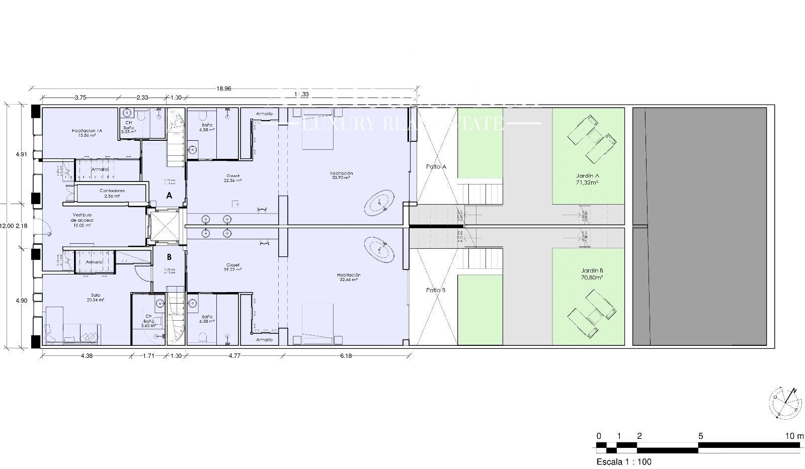 El dúplex de 197 m² cuenta también con jardín privado de 70 m², un espacioso salón-comedor, cocina equipada abierta al salón, tres habitaciones y tres baños.