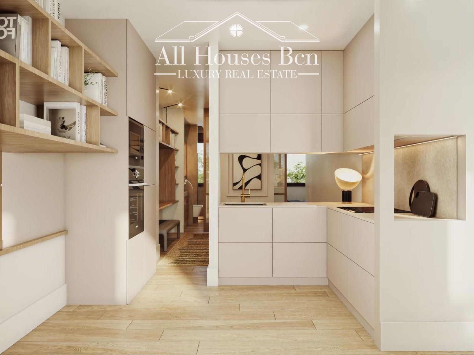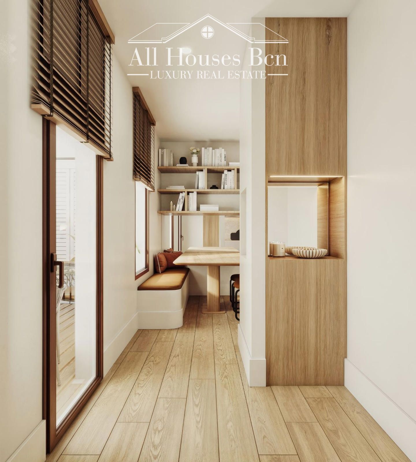 Los acabados son de primera calidad: suelos de parquet de roble natural, armarios empotrados a medida, cocina con encimera de porcelánico marmolado y un baño con microcemento, ducha integrada y sanitarios suspendidos.